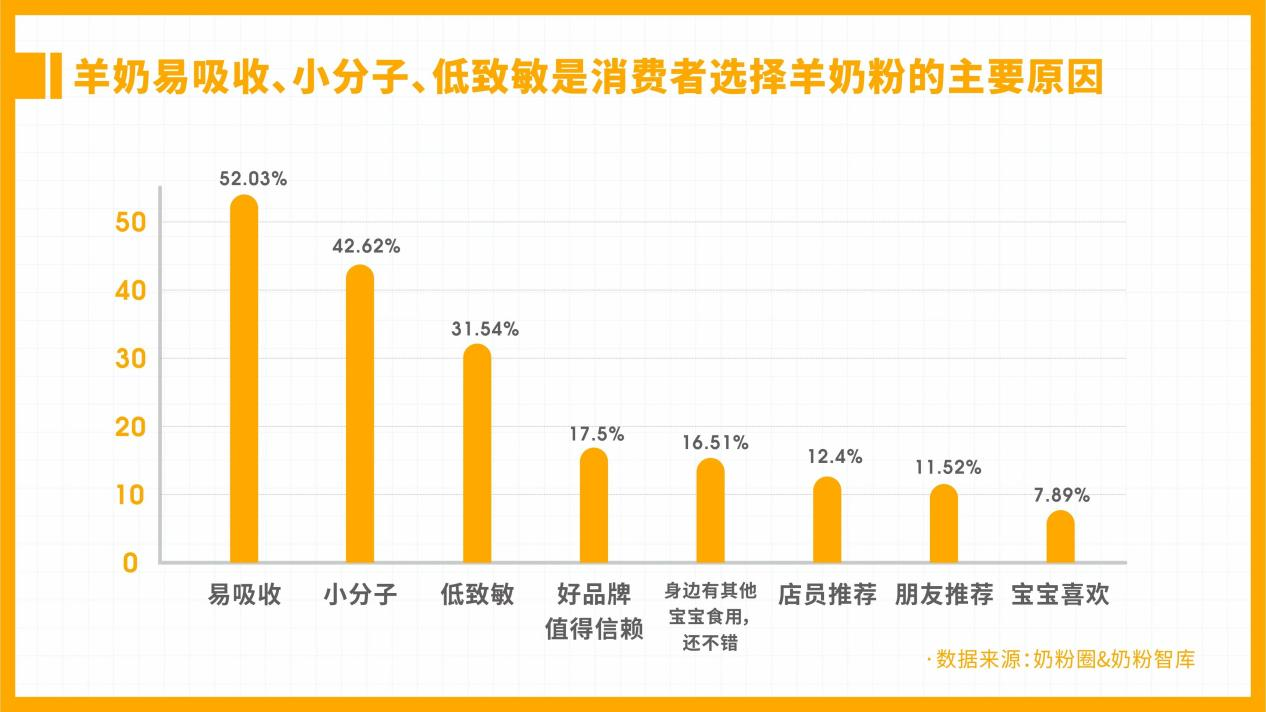 根据奶粉智库发起的《2021中国家庭奶粉&营养品消费调研》,消费者对羊奶粉的接受度高,且羊奶易吸收、小分子、低致敏的特点是消费者选择羊奶粉的主要原因。