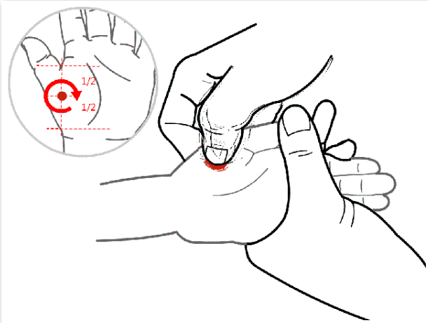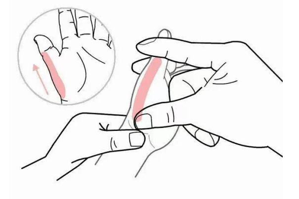从手掌的虎口沿着靠近拇指方向推向食指指尖